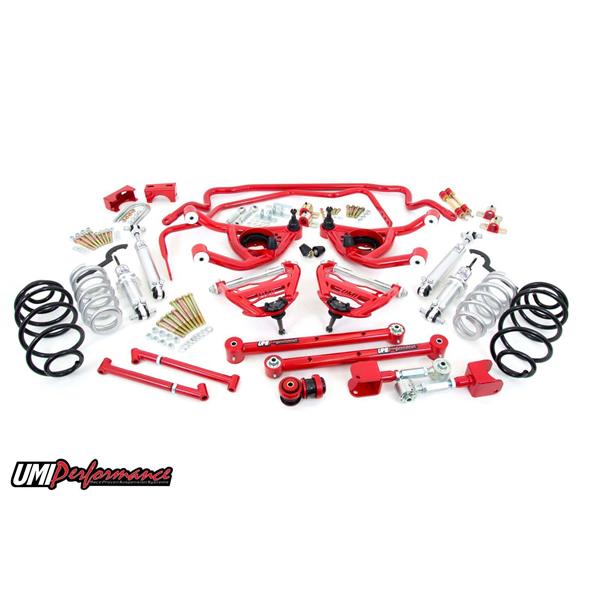 Who says you can't have it all? UMI's Stage 4 kit transforms your A-body into a handling machine with the adjustability to perform well at the strip or haul your family comfortably - to the autocross. If drag racing is more your style, a few minor changes at initial purchase (or down the road) will have you launching with the best of them, then canyon carving on the way home! Up front we start with UMI's proven upper and lower tubular a-arms loaded with ½" taller upper ball joints. The upper a-arms increase caster, without additional shims, for a precise steering feel and straight line stability. The lower a-arms are loaded with UMI-built Delrin bushings for smooth motion and precise steering. Viking's front hybrid coilovers with double adjustable shocksallows ride height, compression and rebound adjustment. The ride height adjustment is accomplished with the included spanner wrenches and thrust washers. The compression and rebound adjusters are clicked by hand (no tools!) and feature a total of 361 possible valving combinations. The front is completed by UMI's 1.250" chromoly handling sway bar. Out back UMI stiffens the chassis with adjustable tubular frame braces which stabilize the Poly/Roto combo lower trailing arms and fully adjustable Roto-Joint upper control arms. 1" or 2" rear lowering springs (please specify at checkout) are controlled by Viking"s double adjustable rear shocks, once again featuring 361 possible combinations. Rounding out the rear is our three way adjustable 1" tubular Pro-Tour sway bar. This handling sway bar attaches to the axle housing and also to the rear crossmember for a bind-free system (requires drilling four 3/8" holes). As always, this kit features UMI's quality red or black powder coat and premium hardware. All UMI components are manufactured with pride in Philipsburg, PA USA.