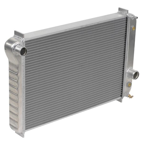 Introducing our new single row radiator which features one 1 1/2" tubes. This design increases cooling surfaces by 50% over the stock unit. An excellent choice for the economy minded customer that wants to eliminate failures from plastic end tanks and gasket leaks. This unit use the same full size aluminum end tanks from our double row, increasing fluid capacity.