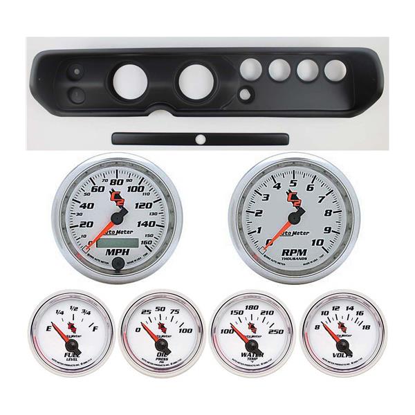 ABS UV Resistant plastic dash panel comes pre-drilled with 3 3/8 for the Speedo and Tach. The 4 smaller holes are 2 1/16.