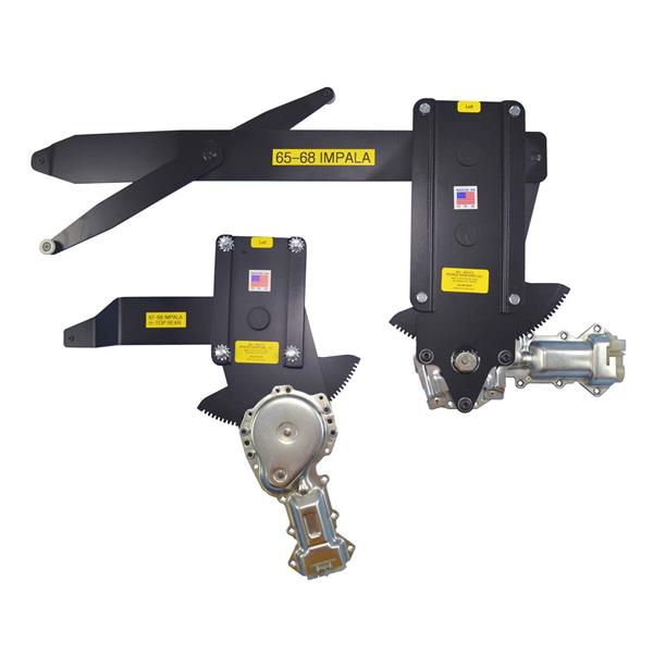 Kit includes: 4 regulators (left & right front, left & right rear), 4 new ACI motors, completed wire harness, standard chrome switches for console placement and conduit to protect the wires going thru the doors.