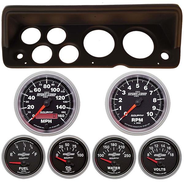 ABS UV Resistant plastic dash panel comes pre-drilled with 3 3/8 for the Speedo and Tach. The 4 smaller holes are 2 1/16.