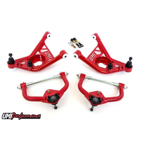 UMI's 2nd Generation F-body performance a-arms are perfect for the F-body enthusiast seeking to improve the performance and blur the lines between race and street use. This kit features caster relocation of both the upper and lower ball joints to enhance steering feel and improve high speed stability. As designed, the caster potential is 8+ degrees. The spindle pin location remains unchanged so fender clearance is like stock. The adjustable upper a-arms reduce the need for shims in addition to providing an easy way to achieve desired camber and caster settings. They also include a tall ball joint to improve camber gain. Upper and lower a-arms are designed to allow proper suspension movement and approved steering response using UMI built Delrin bushings and Teflon lined rod ends. The heavy duty lower spring bucket accepts factory and aftermarket coil springs as well as the popular hybrid coilover units. Laser cut UMI reinforcement plates add a great appearance and excellent strength. UMI's double shear swivel sway bar end links are included and work nicely with UMI P/N 4035 sway bar and also most aftermarket stock eyelet type sway bars. Available in UMI red or gloss black powder coat. 100% designed, manufactured and raced with pride in Philipsburg, PA - USA.