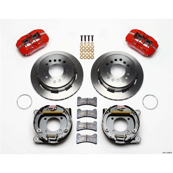 Forged Dynapro Low-Profile Pro-Series rear disc brake kits provide a complete solution for popular muscle car rear axles on applications that require a parking brake assembly and extra clearance for 14.00 to 15.00 wheel applications. Forged billet Dynapro Low-Profile four-piston calipers 11.00 one-piece hat and rotor assemblies, and high friction pads provide optimized and balanced braking for all types of custom performance street/strip and show machines. The neatly hidden internal shoe system provides a clean installation with superior static holding power for parking. Optional caliper finishes and rotor designs enable the builder to personalize the style and optimize brake performance for every individual application.