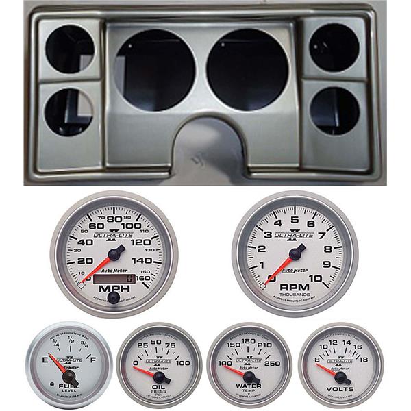 ABS UV Resistant plastic dash panel comes pre-drilled with 5 Inch for the Speedo and Tach. The 4 smaller holes are 2 5/8 Inch.