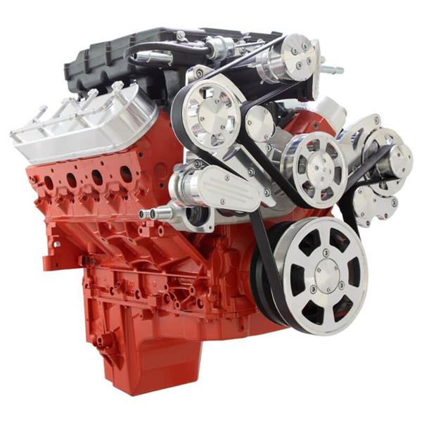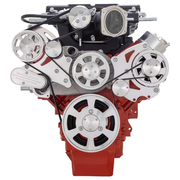 The WRAPTORTM 8 Track Serpentine System for kit Chevy LS engines with Air Conditioning, Power Steering and Alternator. Unique 8 Rib Serpentine pulley design increases grip, reduces stretching and prevents belt slipping when compared to traditional 6 Rib designs. Spring loaded Gates belt tensioner ensures proper tension during hard acceleration and deceleration. Mounts GM Type II Power Steering pump low on driver side and puts a Sanden Peanut style AC Compressor up on the passenger side. Places the alternator on the driver's side above the power steering pump. Uses special LS water pump with provision for bolt on water pump pulley.