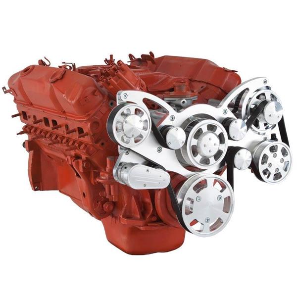 All Inclusive WRAPTORTM 8 Track Serpentine System for Big Block Chrysler engines with 140 Amp alternator and GM Type 2 Power Steering Pump. CVF Racing's 8 Rib Serpentine pulleys increase grip, reduce stretching and prevent slippage compared to traditional 6 Rib designs. Spring loaded Gates tensioner ensures proper tension during hard acceleration and deceleration while compensating for belt stretch. Places alternator on the driver's side above the power steering pump.