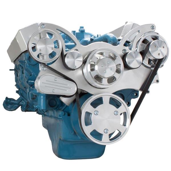 All Inclusive WRAPTORTM 8 Track Serpentine System for Small Block Mopar engines with 140 Amp alternator. CVF Racing's 8 Rib Serpentine pulleys increase grip, reduce stretching and prevent slippage compared to traditional 6 Rib designs. Spring loaded Gates tensioner ensures proper tension during hard acceleration and deceleration while compensating for belt stretch. Places alternator on the driver's side above the power steering pump.