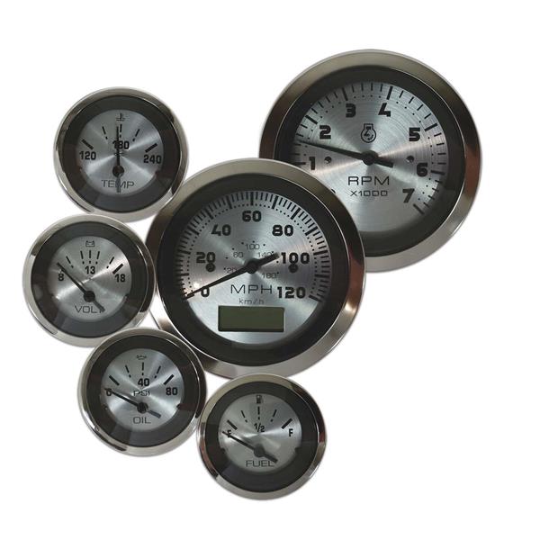 This six gauge kit includes a 120 MPH GPS controlled Speedometer and receiver that is accurate with any gear ratio or tire size and requires NO cables or transmission senders to function. Kits also include 7000 RPM tach, water temp and oil pressure gauges with senders, voltmeter, universal fuel level gauge with a float style sender, and a momentary function switch. Gauges are assembled in the USA and come standard with a Five Year Warranty!