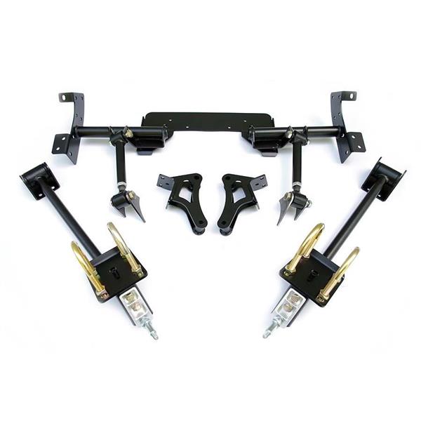 The Ridetech Bolt-On 4-Link installs onto the oem leafspring mounts of your prized musclecar... no cutting, no fabrication, just 4 small tabs to weld to the axle for your upper bars. The ride height of your car is typically lowered by approximately 2". The ride quality is dramatically improved over stock... instead of a wallowing soft ride you'll experience a crisp, controlled ride quality that will inspire more confidence for performance driving.