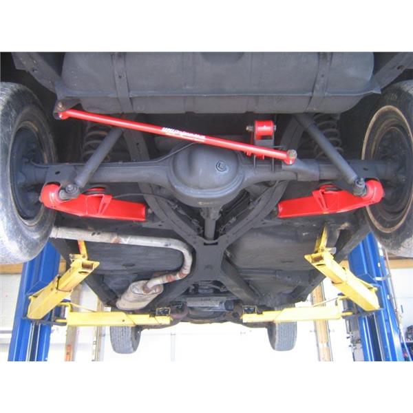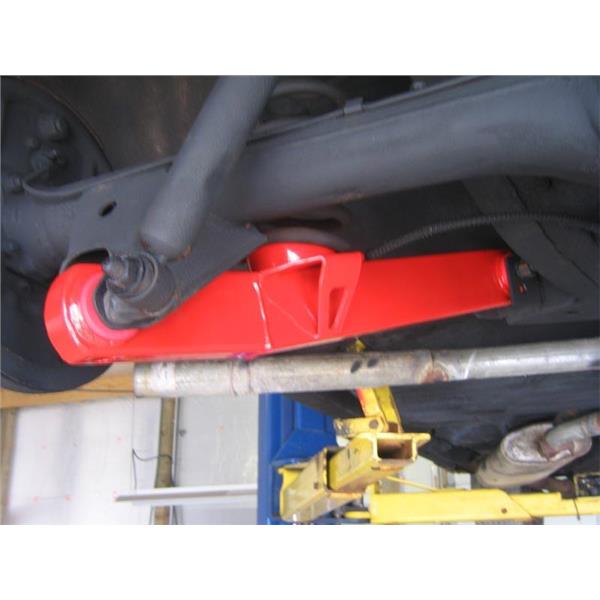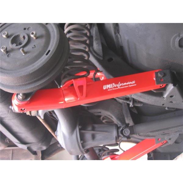 Replace your weak, factory stamped lower control arms with UMI's single adjustable tubular setup. These direct bolt-on replacements minimize wheel hop, improve cornering while lowering ET's and helping track consistency. The spherical rod endallows for a "bind free" operation allowing the rear end to articulate properly making these a great upgrade for both your track and auto cross driven car. The supplied polyurethane bushings are designed to be bolted to the vehicle chassis for a quiet comfortable operation as they absorb unwanted road noise. Control arms are constructed of drawn over mandrel tubing, 4140 chrome moly threaded tube adapters and are completely CNC machined and fully TIG welded for outstanding strength. The rubber OEM bushings are replaced with grease-able Energy Suspension fluted polyurethane bushings and a heavy duty Teflon lined QA1 spherical rod end. Rear end adjustments can be made using the high quality QA1 Teflon lined spherical rod end that operates for a quiet bind free performance.