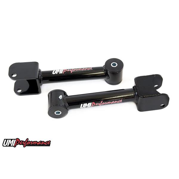 UMI's rear control arms are a bulletproof addition to your car. Suitable for street, strip or corner carving, these arms minimize suspension deflection for a crisp handling setup and less wheel hop. UMI's heavy duty upper control arms are CNC machined for accuracy and feature MIG welded bushing holders and " thick laser cut mounting pads. These simple bolt in replacements install in one hour or less and are designed to work on all rear end housings. UMI's upper control arms are assembled with high quality greaseable polyurethane bushings and finished in a durable glossy powder coat.