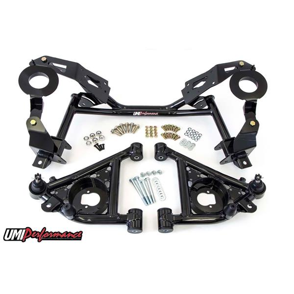 We all know weight equals horsepower. UMI"s direct bolt-in replacement K-member and lower a-arm kit instantly removes 25 lbs of front end weight from your ride and helps your existing horsepower work for you. Strong dual tube construction and a host of high-strength features ensure the P/N 240131 will survive street use, drag strip blasts and autocross action. The K-member is fabricated from CNC machined 3/16" thick mild steel held together by a strong dual tube lower section. Factory clamshell and engine mounts bolt to the precision machined mounting pads while both factory and aftermarket suspension is located by strong boxed mounting points. Lightening holes are CNC machined into the mounting plates and the tubular construction provides added clearance for aftermarket exhaust. The k-member design permits stock spring and strut use while the lower a-arms feature a spring locating pocket. The lower a-arms feature TIG welded tubular construction, adjustable steering stops and polyurethane bushings. Street and track testing on UMI's "89 IROC test car has shown this K-member and a-arm kit to be strong, reliable and a great upgrade for your high performance ride. Available in tough powder coated red or black finish. Manufactured with pride in Philipsburg, PA USA.
