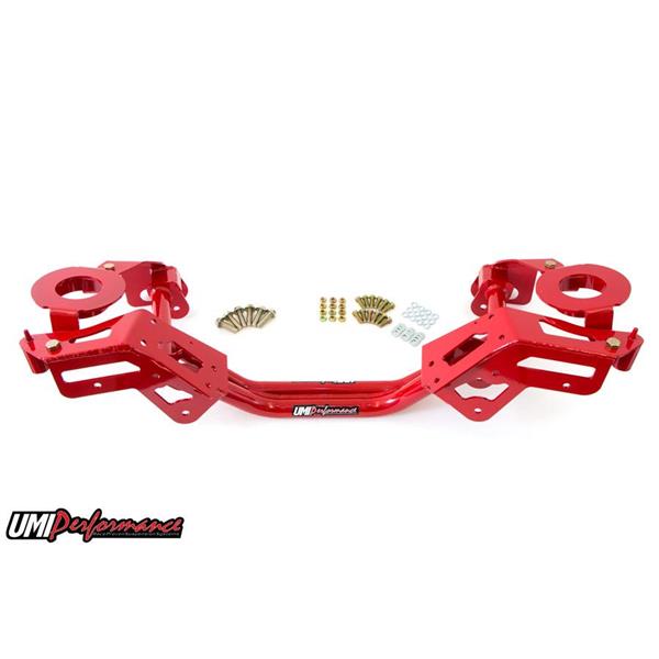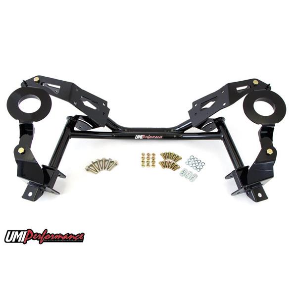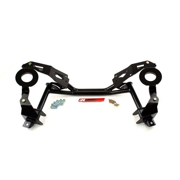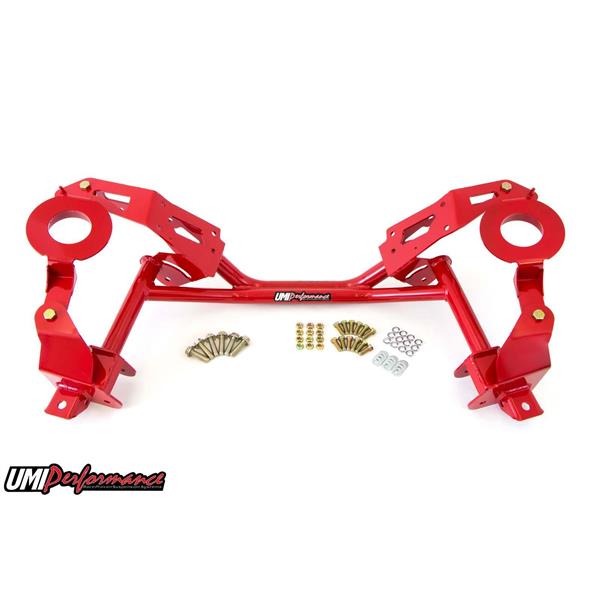 We all know weight equals horsepower. UMI"s direct bolt-in replacement K-member instantly removes 20 lbs of front end weight from your ride and helps your existing horsepower work for you. Strong dual tube construction and a host of high-strength features ensure the P/N 2401 will survive street use, drag strip blasts and autocross action. The K-member is fabricated from CNC machined 3/16" thick mild steel held together by a strong dual tube lower section. Factory clamshell and engine mounts bolt to the precision machined mounting pads while both factory and aftermarket suspension is located by strong boxed mounting points. Lightening holes are CNC machined into the mounting plates and the tubular construction provides added clearance for aftermarket exhaust. The modular design permits stock spring and strut use or simply remove the spring pockets and convert to coil-overs. Street and track testing on our "89 IROC test car has shown this K-member to be strong, reliable and a great upgrade for your high performance ride. Available in tough powder coated red or black finish. Manufactured with pride in Philipsburg, PA - USA