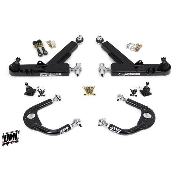 UMI’s heavy duty boxed arm kit with adjustable rod ends provides a rock-solid foundation for your autocross, road race or corner carving 4th Gen. The lower a-arms fully gusseted box tubing construction, while appearing heavy-duty, affords a five pound weight savings per set over factory lower a-arms. These arms have double shear sway bar mount tabs with endlink set included as well as a double shear shock mount to fit most 1/2" bolt race shocks. Lower arms are compatible with UMI/Strano, Viking, Penske, JRi, and most other race shocks. Upper arms feature caster and camber adjustment with premium rod ends. Laser cut ball joint pads feature improved ball joint angle and increased caster (up to additional 2 degrees - depending on chassis tolerances) for lowered cars and come assembled with premium ball joints. UMI’s newest design features the most travel and clearance of any a-arm on the market and is a must for lowered vehicles. This A-arm kit designed to work with the factory K-member, UMI k-members, and virtually all stock mounting point aftermarket K-members. Crafted with pride in Philipsburg, PA- USA.