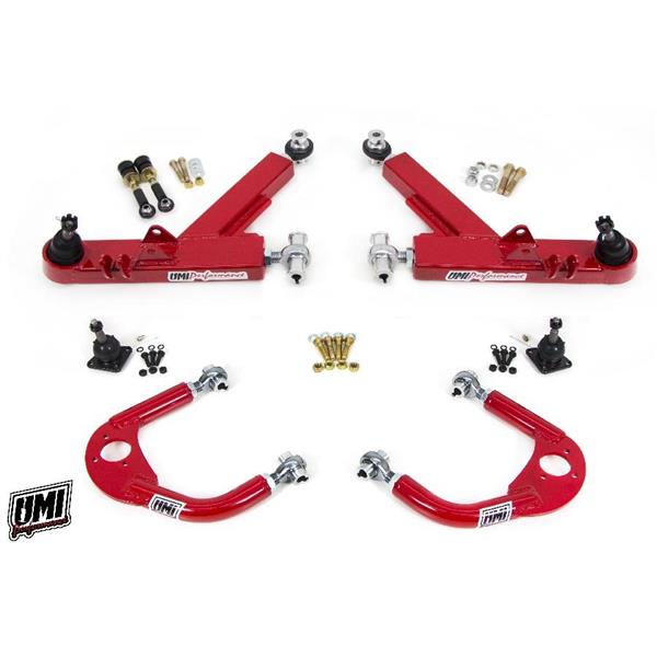 UMI’s heavy duty boxed arm kit with adjustable rod ends provides a rock-solid foundation for your autocross, road race or corner carving 4th Gen. The lower a-arms fully gusseted box tubing construction, while appearing heavy-duty, affords a five pound weight savings per set over factory lower a-arms. These arms have double shear sway bar mount tabs with endlink set included as well as a double shear shock mount to fit most 1/2" bolt race shocks. Lower arms are compatible with UMI/Strano, Viking, Penske, JRi, and most other race shocks. Upper arms feature caster and camber adjustment with premium rod ends. Laser cut ball joint pads feature improved ball joint angle and increased caster (up to additional 2 degrees - depending on chassis tolerances) for lowered cars and come assembled with premium ball joints. UMI’s newest design features the most travel and clearance of any a-arm on the market and is a must for lowered vehicles. This A-arm kit designed to work with the factory K-member, UMI k-members, and virtually all stock mounting point aftermarket K-members. Crafted with pride in Philipsburg, PA- USA.