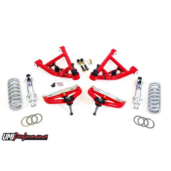 Tremendous front grip and a host of features can be yours with UMI’s complete front end Grip Kit. The included a-arm kit enables 10 degrees caster while maintaining standard track width and wheelbase. Lower a-arms are assembled with tall lower ball joints to optimize roll center, camber gain, and center of gravity. Lower a-arms feature Delrin bushings for smooth travel and bind free performance. The new lower a-arm works in conjunction with the included adjustable upper arm which features minimum shim adjustability, Proforged ball joints, and super smooth Teflon lined rod ends. The front sway bar attaches using UMI’s swivel style end link design and double shear mounting system. The included Viking Crusader coilover shocks mount to the lower a-arm in double shear quick change brackets. The lower shock mount is removable to allow spring and shock changes at the track. UMI’s kit features Viking Crusader shocks with AT pro-touring valving (high rebound tie down for road race and auto-x) and a true 2-1/2” racing coilover. The upper stud mount fits in factory location while the lower is optimized to fit UMI’s 3057-1 coilover lower a-arm. Some grinding is required for installation in the upper frame spring bucket. Other spring rates and valve codes are available. Battle tested on the iconic UMI Green Machine. Kit is available in UMI red or black powder coat. 100% designed, manufactured and raced with pride in the USA.