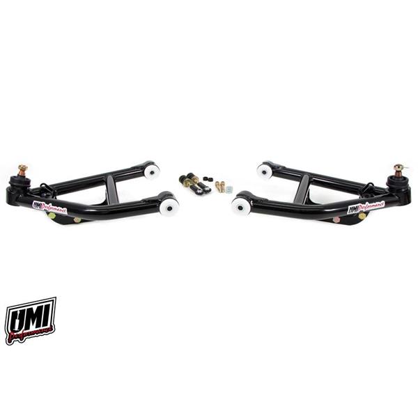 UMI’s Corner Max line of race worthy tubular a-arms are designed from the ground up to be the best performing stock mount a-arm upgrade on the market. The P/N 4062 arms are strong yet lightweight and feature a removable lower mounting system to permit spring changes at the track without separating the ball joints. The ball joint cup is moved forward the proper amount to add up to 4 degrees caster potential and is loaded with high quality Howe standard height ball joints. The double shear coilover mount accepts race industry standard ½” rod end shocks and comes with spacers for all popular models. Also included is a double shear sway bar mount and corresponding end link. The end link fits UMI 4035 and 4067 as well as many other factory fit sway bars. The P/N 4062 excels when paired with tall 2” lowering spindles (tall spindle requires 4056 and standard ball joint height upper and lower).
