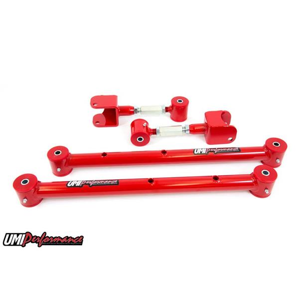 This kit manufactured by UMI Performance includes a set of tubular rear lower control arms and a set of adjustable rear upper control arms. This control arm kit is a direct bolt-on replacement designed to minimize wheel hop, improve cornering and help track consistency on you're A-Body vehicle. Stock control arms are on the borderline of junk, bushing deflection and rusting weak stamped material add for traction loss and poor handling ability. Whether your car is a weekend cruiser or weekend track addict this kit works on all applications. Lower control arms feature grease-able Energy Suspension bushings, TIG welded construction for the utmost in strength and correct provisions for adding a stock or aftermarket sway bar. Sway bar holes are reinforced with a 0.120" wall thickness steel sleeve TIG welded and sanded into place to prevent the control arm from crushing. The included adjustable upper control arms allow you to adjust your vehicles pinion angle for optimum performance, precise handling and improved traction. Adjustable upper control arms are constructed of CNC machined 0.250" steel mounting plates, 4140 chromoly threaded tube adapters and a high strength, 4140 chromoly, heat treated 1.000" solid adjuster. UMI Performance's unique on-car adjuster allows for easy adjustments with out removing or unbolting the control arm from the vehicle. These control arms also feature grease-able Energy Suspension fluted polyurethane bushings and durable gloss powder coat.
