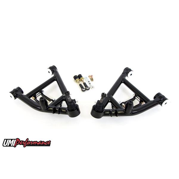 Tremendous front grip and a host of features can be yours with UMI’s 305756-3 kit. This a-arm kit enables 10 degrees caster while maintaining standard track width and wheelbase. The lower shock mount is removable to allow spring/shock changes at the track. The tall lower ball joint optimizes roll center, camber gain, center of gravity and lowers ride height by ½”. Delrin bushings help the lower a-arm to travel smoothly for bind-free operation. The new lower a-arm works in conjunction with our popular 3056-3 adjustable upper arm which features minimal shim adjustability, 1” taller-than-stock ball joints and super smooth rod ends. Also included on the lower a-arm is a double shear sway bar mounting system which accepts UMI sway bars and many other manufacturers stock location aftermarket units. An aluminum steering stop is adjustable and limits steering lock to prevent tire and wheel damage. Available in UMI red or black powder coat. 100% designed, manufactured and raced with pride in the USA. Battle tested on the iconic UMI Green Machine.