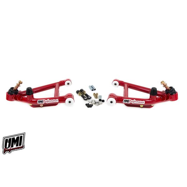 Tremendous front grip and a host of features can be yours with UMI’s 305756-3 kit. This a-arm kit enables 10 degrees caster while maintaining standard track width and wheelbase. The lower shock mount is removable to allow spring/shock changes at the track. The tall lower ball joint optimizes roll center, camber gain, center of gravity and lowers ride height by ½”. Delrin bushings help the lower a-arm to travel smoothly for bind-free operation. The new lower a-arm works in conjunction with our popular 3056-3 adjustable upper arm which features minimal shim adjustability, 1” taller-than-stock ball joints and super smooth rod ends. Also included on the lower a-arm is a double shear sway bar mounting system which accepts UMI sway bars and many other manufacturers stock location aftermarket units. An aluminum steering stop is adjustable and limits steering lock to prevent tire and wheel damage. Available in UMI red or black powder coat. 100% designed, manufactured and raced with pride in the USA. Battle tested on the iconic UMI Green Machine.