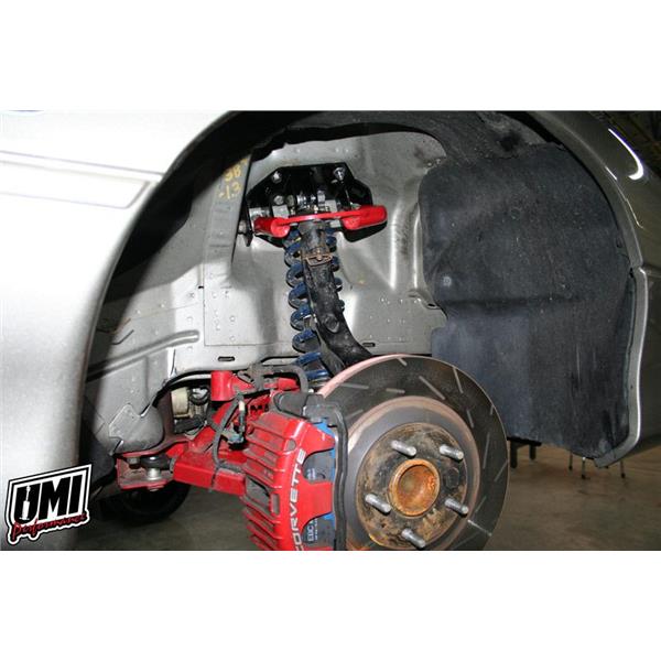 When looking to mount a coilover to the front of your 4th generation Camaro or Firebird, look no further than UMI’s new #2335 fabricated adjustable coilover a-arm mounts. The UMI upper a-arm mount is a direct bolt in upgrade that replaces the original GM mount and helps when converting to coilovers. The two stand-off tabs are angled perfectly to attach any bearing mounted coilover. Spacers are included to install coilover shocks with 1” or 1-1/4” wide bearing. UMI’s product features a unique fabricated design that allows the mounts to be strong without adding any extra weight. UMI’s kit is supplied with three upper a-arm adjustment holes for fine tuning the vehicles front suspension. The original factory holes are located at the center and driver has the option to raise or lower the a-arm mounting point 3/8 of an inch. Adjustment holes feature the ability to dial in the front roll center height. Raising the roll center height increases responsiveness and improves camber gain which allows a less aggressive street alignment to perform well when cornering. For street and drag applications choosing the center hole places the a-arm in the factory location. For ultimate performance use with UMI’s lower a-arms P/N 2317 or 2314 to run a true bearing to bearing mounted coilover (no more t-bar). As always, these products are extensively tested on UMI’s test cars in some of the harshest highway and racing environments. This makes them an excellent upgrade for the street cruiser to the road course expert.