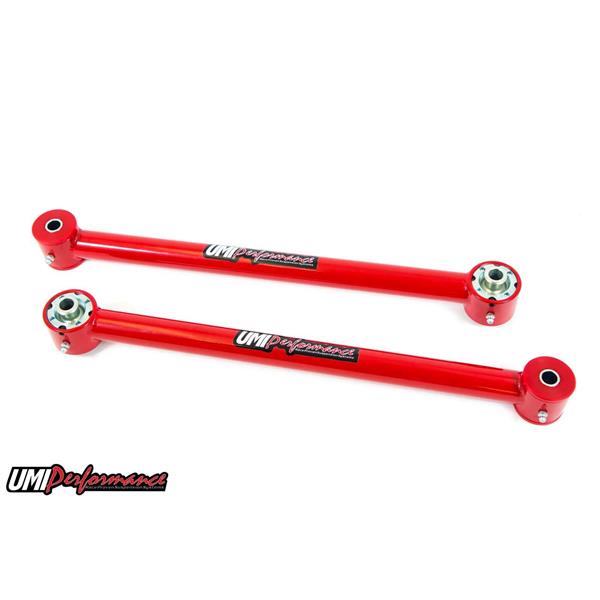 UMI's tubular lower control arms for the 2005 and up Ford Mustang utilize our Roto-Joint technology for a bind free performance and quiet comfortable ride quality. The Roto-Joint design is a pivot ball lined with a greaseable delrin race designed to offer 28 degrees of total unrestricted movement, more than adequate for a bind free, low friction operation. The Roto-Joint design improves performance over the factory rubber and aftermarket polyurethane bushings by allowing the suspension to articulate correctly, and provide precision handling. The installed UMI Roto-Jointallows rear end free movement when high handling, auto cross or road race is a concern while still being a 100% streetable setup. The installed delrin race, which lines the spherical ball, absorbs shock and road noise for a quiet and smooth operation on any street or track driven vehicle. This control arm set features polyurethane bushings on one end and UMI"s swivel Roto-Joint on the other end. This set-up is designed for street performance and street enthusiast. The polyurethane bushing end is designed to be bolted to the vehicle chassis side while the Roto-Joint attaches to the rear end side. Since the polyurethane bushings are softer they are designed to absorb more road noise and shock before it enters the passenger compartment of the vehicle. All bushing ends and Roto-Joints are greaseable and low maintenance making an excellent street setup for your cruiser!