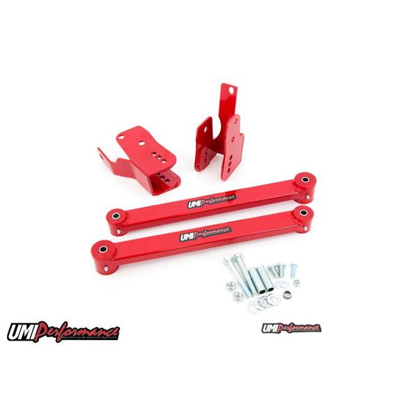 Wheel hop or traction issues? UMI has the solution! Optimize your vehicle's instant center and improve forward traction by lowering the rear of the lower control arm and adding heavy duty control arms. UMI"s anti-hop kit is designed to increase traction during launch and reduce unwanted wheel hop. Choose 2", 2-3/4" or 3-1/4" drop to optimize vehicle handling and traction. UMI"s anti-hop kit installed can provide an average 0.10 second (or better) 60-foot reduction and an overall improvement in launch consistency. Anti-hop kit relocation brackets are constructed of a combination of 1/4" and 3/16" CNC laser cut steel plate for ultimate strength and high horsepower applications. The included box control arms are machined from 1"x 2" boxed steel tubing and feature greaseable polyurethane bushings. Anti-hop kit is designed to work on both lowered and non-lowered vehicles and feature multiple settings to optimize vehicle handling and traction.