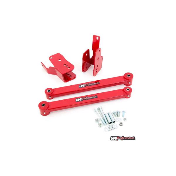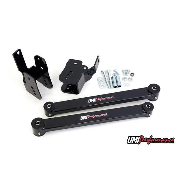 Wheel hop or traction issues? UMI has the solution! Optimize your vehicle's instant center and improve forward traction by lowering the rear of the lower control arm and adding heavy duty control arms. UMI"s anti-hop kit is designed to increase traction during launch and reduce unwanted wheel hop. Choose 2", 2-3/4" or 3-1/4" drop to optimize vehicle handling and traction. UMI"s anti-hop kit installed can provide an average 0.10 second (or better) 60-foot reduction and an overall improvement in launch consistency. Anti-hop kit relocation brackets are constructed of a combination of 1/4" and 3/16" CNC laser cut steel plate for ultimate strength and high horsepower applications. The included box control arms are machined from 1"x 2" boxed steel tubing and feature greaseable polyurethane bushings. Anti-hop kit is designed to work on both lowered and non-lowered vehicles and feature multiple settings to optimize vehicle handling and traction.