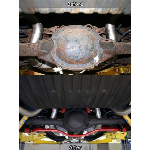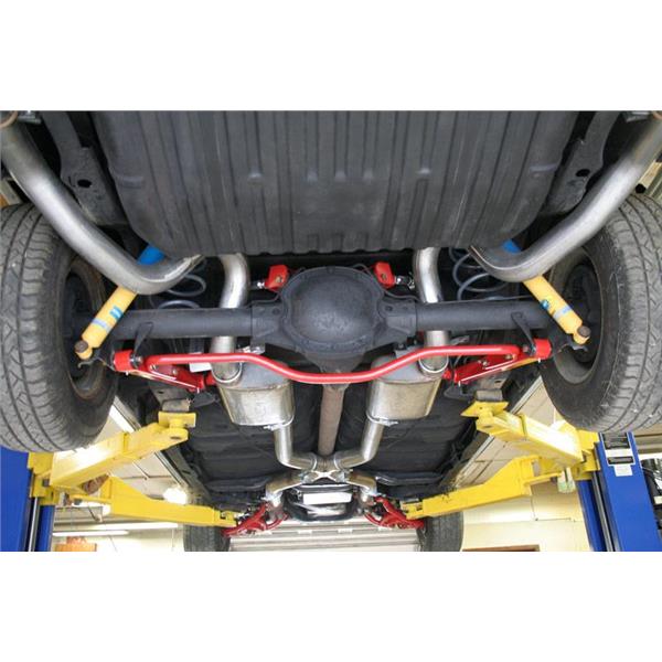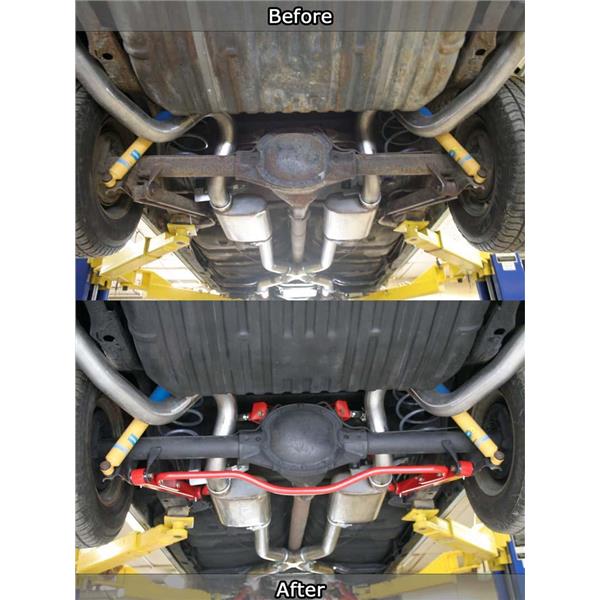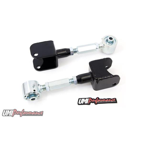Eliminate wheel hop, increase traction and improve handling performance with an easy bolt on installation. UMI Performance's adjustable upper controls feature on car adjustability and are supplied with spherical Roto-Joints. The Roto-Joint design is a pivot ball lined with a greaseable delrin race designed to offer 28 degrees of total unrestricted movement, more than adequate for a bind free, low friction operation. The Roto-Joint design improves performance over the factory rubber and aftermarket polyurethane bushings by allowing the suspension to articulate correctly, and provide precision handling. The installed UMI Roto-Jointallows rear end free movement when high handling, auto cross or road race is a concern while still being a 100% streetable setup. The installed delrin race, which lines the spherical ball, absorbs shock and road noise for a quiet and smooth operation on any street or track driven vehicle.