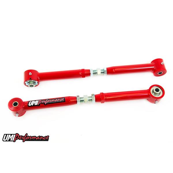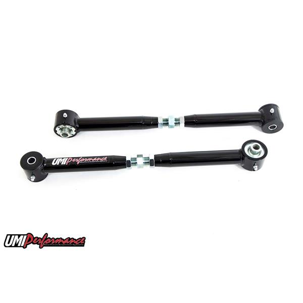 UMI's on car adjustable lower control arms utilize UMI's Roto-Joint technology for a bind free performance, quiet ride quality, and also offer on car adjustment. The control arms can be adjusted longer or shorter moving the rear end back or forward to squeeze those larger tires in the fender wells. Adjustable control arms are also recommended for most aftermarket rear end installs to center the rear end and prevent tire rubbing. The installed Roto-Joint is a pivot ball lined with a greaseable delrin race designed to offer 28 degrees of total unrestricted movement, more than adequate for a bind free, low friction operation. The Roto-Joint design improves performance over the factory rubber and aftermarket polyurethane bushings by allowing the suspension to articulate correctly, and provide precision handling. This control arm set features polyurethane bushings on one end and UMI"s spherical Roto-Joint on the other end. This set-up is designed for street performance and street enthusiast. The polyurethane bushing end is designed to be bolted to the vehicle chassis side while the Roto-Joint attaches to the rear end side. Since the polyurethane bushings are softer they are designed to absorb more road noise and shock before it enters the passenger compartment of the vehicle. All bushing ends and Roto-Joints are greaseable and low maintenance making an excellent street setup for your cruiser!