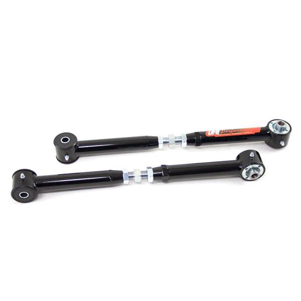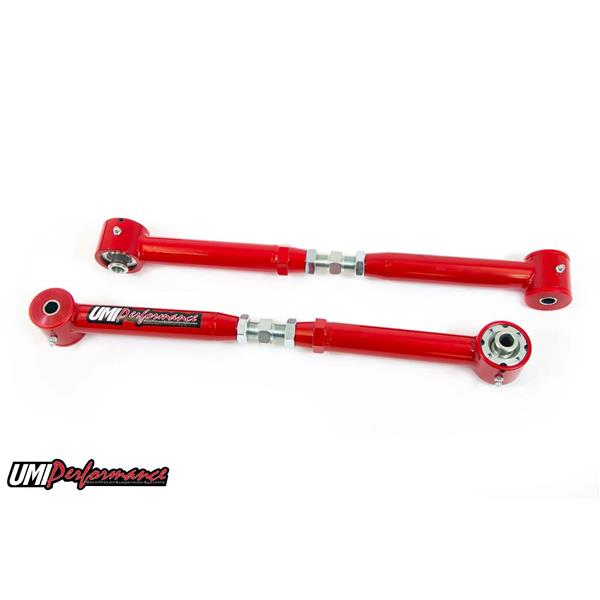 UMI's on car adjustable lower control arms utilize UMI's Roto-Joint technology for a bind free performance, quiet ride quality, and also offer on car adjustment. The control arms can be adjusted longer or shorter moving the rear end back or forward to squeeze those larger tires in the fender wells. Adjustable control arms are also recommended for most aftermarket rear end installs to center the rear end and prevent tire rubbing. The installed Roto-Joint is a pivot ball lined with a greaseable delrin race designed to offer 28 degrees of total unrestricted movement, more than adequate for a bind free, low friction operation. The Roto-Joint design improves performance over the factory rubber and aftermarket polyurethane bushings by allowing the suspension to articulate correctly, and provide precision handling. This control arm set features polyurethane bushings on one end and UMI"s spherical Roto-Joint on the other end. This set-up is designed for street performance and street enthusiast. The polyurethane bushing end is designed to be bolted to the vehicle chassis side while the Roto-Joint attaches to the rear end side. Since the polyurethane bushings are softer they are designed to absorb more road noise and shock before it enters the passenger compartment of the vehicle. All bushing ends and Roto-Joints are greaseable and low maintenance making an excellent street setup for your cruiser!