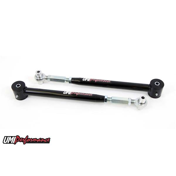 UMI's on-car adjustable lower control arms are supplied with a spherical rod end and polyurethane bushing combination. This set-up is designed for street performance and street enthusiast. The polyurethane bushing end is designed to be bolted to the vehicle chassis side while the Roto-Joint attaches to the rear end side. Since the polyurethane bushings are softer they are designed to absorb more road noise and shock before it enters the passenger compartment of the vehicle. The adjustment of the control armsallows them to be adjusted longer or shorter moving the rear end back or forward to squeeze those larger tires in the fender wells. Adjustable control arms are also recommended for most aftermarket rear end installs to center the rear end and prevent tire rubbing. These control arms feature on-car adjustability. Making adjustments is as simple as loosening two jam nuts and using UMI"s chrome moly on car adjuster. Simply turn the adjuster with the control arms attached to the vehicle to quickly lengthen or shorten the control arm to the desired length. Control arms are CNC machined and TIG welded for superior strength and perfect fitment.