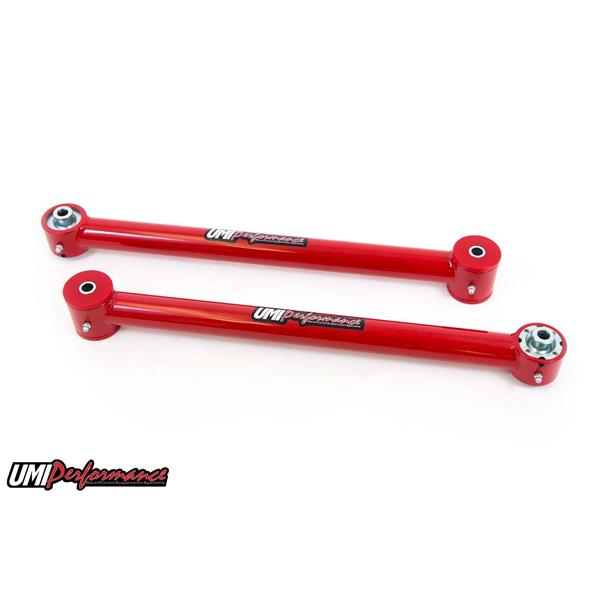 UMI's tubular lower control arms for the 1982-2002 GM F-Body utilizes the Roto-Joint technology for a bind free performance and quiet comfortable ride quality. The Roto-Joint design is a pivot ball lined with a greaseable delrin race designed to offer 28 degrees of total unrestricted movement, more than adequate for a bind free, low friction operation. The Roto-Joint design improves performance over the factory rubber and aftermarket polyurethane bushings by allowing the suspension to articulate correctly, and provide precision handling. The installed UMI Roto-Jointallows rear end free movement when high handling, auto cross or road race is a concern while still being a 100% streetable setup. The installed delrin race, which lines the spherical ball, absorbs shock and road noise for a quiet and smooth operation on any street or track driven vehicle. This control arm set features polyurethane bushings on one end and UMI"s swivel Roto-Joint on the other end. This set-up is designed for street performance and street enthusiast. The polyurethane bushing end is designed to be bolted to the vehicle chassis side while the Roto-Joint attaches to the rear end side. Since the polyurethane bushings are softer they are designed to absorb more road noise and shock before it enters the passenger compartment of the vehicle. All bushing ends and Roto-Joints are greaseable and low maintenance making an excellent street setup for your cruiser!