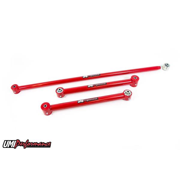 This kit includes a set of rear lower control arms and a single adjustable panhard bar. These items feature polyurethane bushings on one end and UMI's spherical Roto-Joint on the other end. This set up is designed for street performance and street enthusiast. The polyurethane bushing end is designed to be bolted to the vehicle chassis side while the Roto-Joint attaches to the rear end side. Since the polyurethane bushings are softer they are designed to absorb more road noise and shock before it enters the passenger compartment of the vehicle. The Roto-Joint design is a pivot ball lined with a greaseable delrin race designed to offer 28 degrees of total unrestricted movement, more than adequate for a bind free, low friction operation. The Roto-Joint design improves performance over the factory rubber and aftermarket polyurethane bushings by allowing the suspension to articulate correctly, and provide precision handling. The included panhard bar is a must for rear end centering after vehicle lowering, as well as clearance for running larger tires. The installed Roto-Jointallows for adjustments off the car to quickly lengthen or shorten the panhard bar to the desired length. The spherical Roto-Joint/polyurethane bushing combination eliminates most rear end bind while not sacrificing ride quality. All bushing ends and Roto-Joints are greaseable and low maintenance making an excellent street setup for your cruiser!