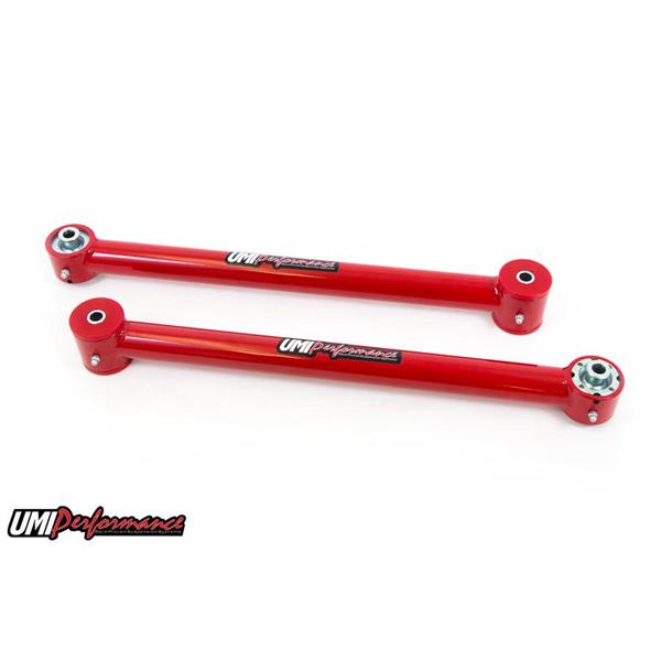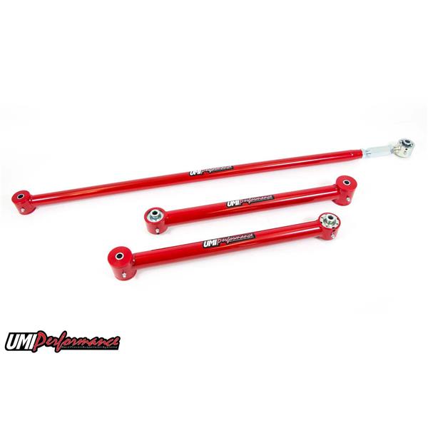 This kit includes a set of rear lower control arms and a on car adjustable panhard bar. These items feature polyurethane bushings on one end and UMI's spherical Roto-Joint on the other end. This set up is designed for street performance and street enthusiast. The polyurethane bushing end is designed to be bolted to the vehicle chassis side while the Roto-Joint attaches to the rear end side. Since the polyurethane bushings are softer they are designed to absorb more road noise and shock before it enters the passenger compartment of the vehicle. The Roto-Joint design is a pivot ball lined with a greaseable delrin race designed to offer 28 degrees of total unrestricted movement, more than adequate for a bind free, low friction operation. The Roto-Joint design improves performance over the factory rubber and aftermarket polyurethane bushings by allowing the suspension to articulate correctly, and provide precision handling. The included panhard bar is a must for rear end centering after vehicle lowering, as well as clearance for running larger tires. The supplied CNC machined double adjuster features left and right hand threads for quick and easy on car adjustments by simply loosening two jam nuts, the panhard bar does not require removal to adjust. The spherical Roto-Joint/polyurethane bushing combination eliminates most rear end bind while not sacrificing ride quality making this is an excellent improvement on any street or drag application. All bushing ends and Roto-Joints are greaseable and low maintenance making an excellent street setup for your cruiser!