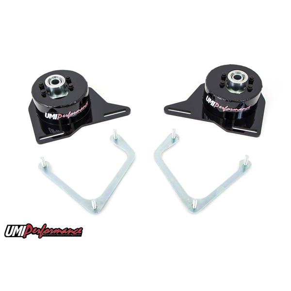 UMI"s heavy duty caster and camber plates allow you to make alignment changes that are not permitted with the factory strut mounts. These heavy duty strut mounts are fully TIG welded using " steel and feature a chrome moly Teflon lined spherical bearing. The chrome moly spherical bearing replaces the factory rubber strut mount bushing. The spherical bearing features a Teflon race which keeps the bearing lubricated and noise free. The UMI strut mounts feature additional adjustment on the mounting plate and the bearing housing allowing the user to make changes for the track and the street. Mounts are also built with increased height to provide additional travel for lowered vehicles.