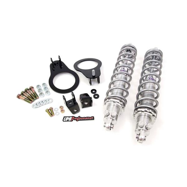 UMI"s bolt-in rear coilover kitallows full ride height, spring rate and damping adjustability for your 1982-2002 Camaro and Firebird. The double shear upper mount is a direct bolt-in and holds a true 2-1/2" racing coilover. The FEA designed lower bracket bolts in using the standard shock mounting hole as well as an additional reinforcement hole. Drilling one 3/8" hole per side is required to complete the installation (no welding). The Viking shock is 19-way adjustable in both compression and rebound and ensures the perfect setting for every application. The 2-1/2" coilover springs are available in 14" 110lb for drag use, 14" 125lb for street use and 12" 150lb for auto-x/road race. This product has been tested with 1-1/2" diameter UMI trailing arms as well as UMI"s 22mm sway bar and 32mm drag anti-roll bar (see our other items). Fitment with other brand sway bars and larger diameter control arms is not guaranteed. 100% manufactured Philipsburg, PA-USA.