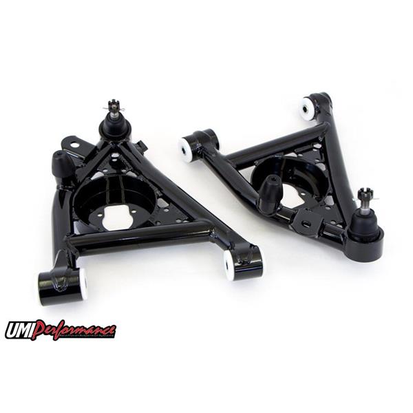UMI has raised the bar. UMI's host of ultra-premium features come together in one package to provide your ride with unmatched precision, performance, durability and quality. UMI's P/N 303233-2 upper and lower a-arm kit replaces the worn out, stock stamped a-arms with high-strength tubular construction and a host of premium features. The lower a-arms feature tough tubular construction and greaseable Delrin bushings for precise handling and smooth suspension motion. We build the Delrin bushings in-house to ensure the ultimate in quality and smooth suspension action. The ball joint mount is angled slightly from stock to permit usage with lowered vehicles and the design offers additional wheel and tire clearance. The tubular upper a-arms are assembled with smooth operating, low deflection UMI designed and manufactured Delrin bushings as well as UMI-built billet chromoly cross shafts. They feature a relocated mounting pad to increase caster without excessive shims and are loaded with " taller upper ball joints to improve camber performance. Both upper and lower a-arms are jig built to maintain accuracy for a perfect fit every time and come preloaded with premium ball joints. Critical areas are TIG welded for superior strength and a clean look. UMI's extensive testing on the street, drag strip and skid pad ensures a quality product able to with stand all types of conditions. The P/N 303233-2 a-arm kit will work with factory springs, lowering springs and coil over kits such as the popular Viking coil over set up. For the best handling and tire life from the UMI designed a-arms, included with each kit are recommended alignment specs along with detailed installation instructions. UMI Performance a-arm kit P/N 303233-2 is shipped fully assembled and ready for installation.