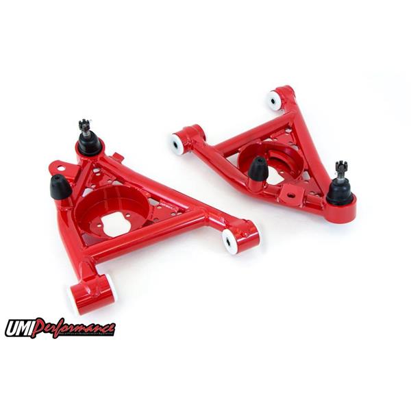 UMI lower A-Arms are fabricated from DOM tubing with CNC machined tube ends for a precision fit. They are jig built to maintain accuracy and bolt on correctly every time. All critical areas are TIG welded for superior strength and a clean look. UMI's lower A-Arms also feature improved ball joint angle for lowered vehicles and the design provides additional tire clearance. These lower a-arms include greaseable, UMI designed and manufactured Delrin bushings. Delrin bushings offer supremely smooth suspension action and precision operation while still providing some insulation from road noise. They come preloaded with polyurethane bump stops, steering stops and premium ball joints. UMI's extensive testing on the street, drag strip and skid pad ensures a quality product able to with stand all types of abuse. UMI lower A-Arms are designed to work with factory springs, lowering springs and coil over kits without changing the a-arms. UMI Performance lower a-arms are shipped fully assembled and ready for installation. Designed and manufactured with pride in Philipsburg, PA - USA.