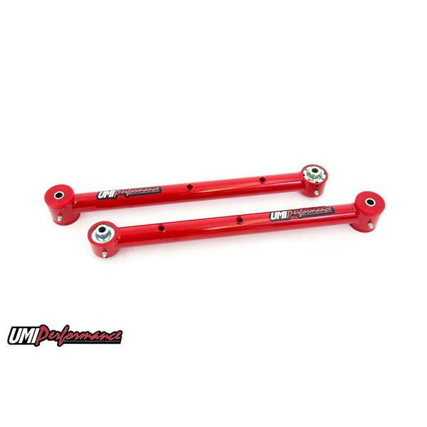 UMI's tubular lower control arms utilize their Roto-Joint technology for a bind free performance and quiet comfortable ride quality. The Roto-Joint design is a pivot ball lined with a greaseable delrin race designed to offer 28 degrees of total unrestricted movement, more than adequate for a bind free, low friction operation. The Roto-Joint design improves performance over the factory rubber and aftermarket polyurethane bushings by allowing the suspension to articulate correctly, and provide precision handling. The installed UMI Roto-Jointallows rear end free movement when high handling, auto cross or road race is a concern while still being a 100% streetable setup. The installed delrin race, which lines the spherical ball, absorbs shock and road noise for a quiet and smooth operation on any street or track driven vehicle. This control arm set features polyurethane bushings on one end and UMI"s swivel Roto-Joint on the other end. This set-up is designed for street performance and street enthusiast. The polyurethane bushing end is designed to be bolted to the vehicle chassis side while the Roto-Joint attaches to the rear end side. Since the polyurethane bushings are softer they are designed to absorb more road noise and shock before it enters the passenger compartment of the vehicle. Both control arms feature the correct provisions for adding a stock or aftermarket sway bar. Sway bar holes are reinforced with a 0.120" wall thickness steel sleeve that is TIG welded and sanded into place. All bushing ends and Roto-Joints are greaseable and low maintenance making an excellent street setup for your cruiser!