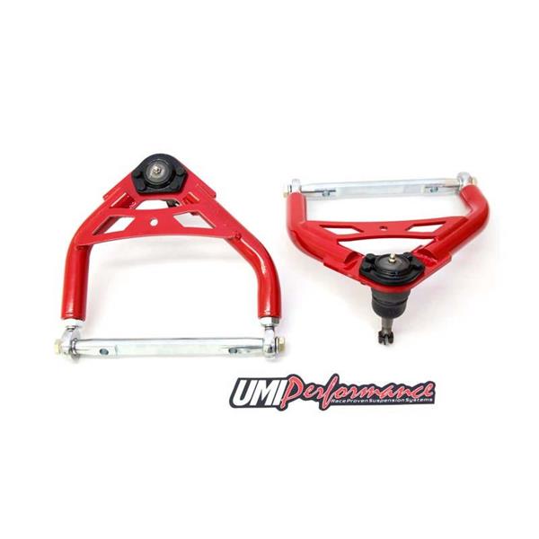 Today's Pro Touring A-bodies are handling like never before. Achieve your goal of awesome handling with UMI"s new adjustable upper a-arm. This arm precisely locates a 0.9" taller upper ball joint which in turn improves the camber curve and results in more front end grip. The advanced design of the a-arm also relocates the ball joint plate rearward for increased caster and improved steering feel. The machined CrMo cross shaft holds two precision rod ends which are used to adjust the arm sections. These arms are TIG welded to the laser cut ball joint pad which houses a 0.9" taller upper ball joint. A laser cut bump stop brace completes the arm. If used for drag racing, the 4056-3 can also accommodate a travel limiter. The 4056-3 a-arm is designed to work with factory height spindles and increases spindle height by 0.9". The 4056-3 a-arm set is available in beautiful red or black powder coat and is hand built in Philipsburg, PA USA of US materials.