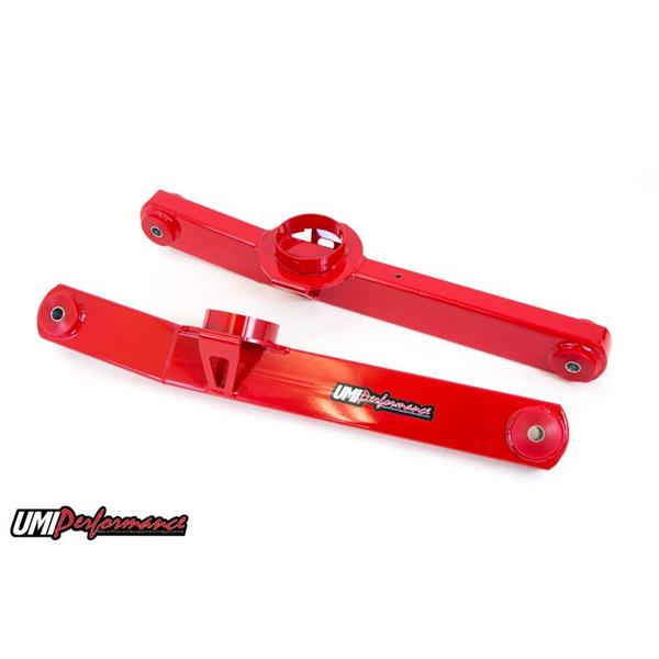 Whether you're classic Chevrolet B-Body is a restoration project, street car, cruiser or even a drag racer the UMI Performance control arm kit is an excellent upgrade. This complete rear suspension kit is a direct bolt-on designed to replace the stock stamped control arms and panhard bar. Over time stock suspension components rust, weakening them, the OEM bushings dry rot, harden and crack decreasing your ride quality and harming vehicle performance. UMI P/N 365002 includes new boxed lower control arms, (2) rear upper control arms, (2) upper control arm mounting brackets, new panhard bar and Grade 8 mounting hardware to mount all the new items. All items are assembled with greaseable polyurethane bushings and are direct factory replacements.