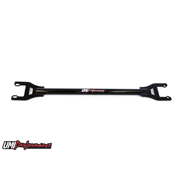 This 100% jig built, bolt-in brace ties the rear upper shock mounts together to share the load and stiffen the chassis. Strong 1-1/4” tubing is MIG welded to 3/16” thick laser cut brackets for a perfect fit. Hardware is included to make this a true, easy bolt-in installation. This brace is designed to clear all of the popular exhaust systems and works equally well on coilover setups and traditional spring/shock combinations. All UMI products are built from US Steel and are available in black and red powder coat. The rear shock tower brace is manufactured, tested and raced out of Philipsburg, PA – USA. Note: Does not fit wagon or El Camino. Car only.