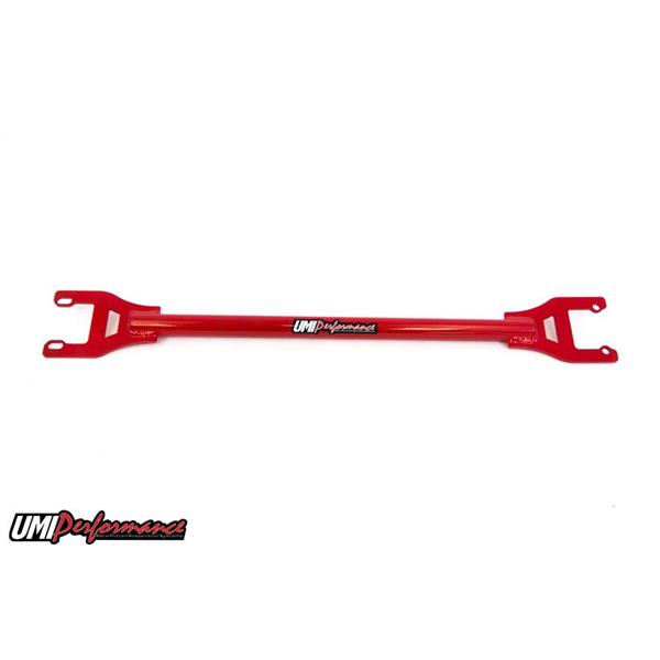 This 100% jig built, bolt-in brace ties the rear upper shock mounts together to share the load and stiffen the chassis. Strong 1-1/4” tubing is MIG welded to 3/16” thick laser cut brackets for a perfect fit. Hardware is included to make this a true, easy bolt-in installation. This brace is designed to clear all of the popular exhaust systems and works equally well on coilover setups and traditional spring/shock combinations. All UMI products are built from US Steel and are available in black and red powder coat. The rear shock tower brace is manufactured, tested and raced out of Philipsburg, PA – USA. Note: Does not fit wagon or El Camino. Car only.