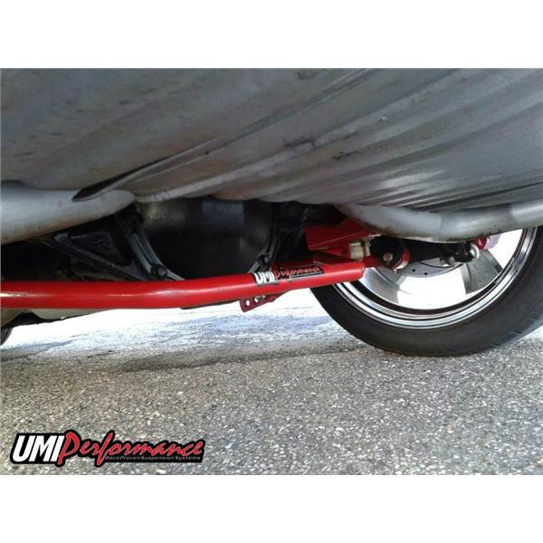 UMI's A-body Pro-Tour style bar is a true multi purpose high performance rear sway bar. The chassis and differential housing mounts reduce bind normally associated with the factory style bars. The bars are 1" diameter hollow and feature three different rates (street/auto-x, road race/strip). UMI's tried and true CNC machined clamping system allows differential housing mounting on 2.75", 3" and 3.25" diameter housings. These can be bolted on, or welded for additional security. The double shear chassis mounts are held in place by four 3/8" fasteners. Drilling through the crossmember is required and a template /instructions are included. The house made hex adjuster allows pre-loading of the bar when used for drag applications so your car leaves straight. Choose the longest hole for street, middle hole for auto-x, road race and the shortest hole for drag use.