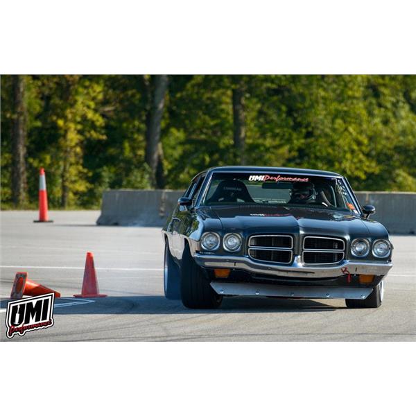 UMI’s Corner Max front end kits are a comprehensive system with our best corner carving parts under one easy to find part number. The Corner Max system combines geometry corrected a-arms with a combination of tall spindles and ball joints, higher rate springs, UMI rebound adjustable monotube shocks, heavy duty sway bar and a bump steer kit. The addition of tall 2” drop spindles with taller ball joints greatly improves camber gain and allows for a low center of gravity. The foundation of the kit includes our coilover-only lower a-arms featuring caster improvement, quality ball joints, and the ability to remove the spring and shock without taking the spindle apart. The upper a-arm features rod ends for smooth operation and the ability to adjust without shims. The 1-5/16” sway bar upgrade complete with UMI’s fabricated end links reduces body roll and helps speed transitions. Racing coilover springs are paired with UMI’s rebound adjustable coilover monotube shocks. Fine tuning is accomplished with a UMI bump steer kit. The Corner Max kit is built to make the stock GM clip work as well as it possibly can with a true bolt-on kit. All UMI Performance parts are fabricated and raced with pride out of Philipsburg, PA – USA. Race proven on the UMI LeMans.