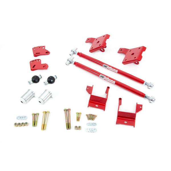 UMI’s 2628 leaf spring traction bars work to improve forward traction and reduce or eliminate wheel hop. These traction bars bolt to UMI leafs or factory leafs with no modification. Dramatically improve performance without cutting, welding or back-halfing your car. Kit is paired with UMI 2624 front mount to further enhance performance and traction. The 2624 mount includes the popular “Herb Adams mod” to improve instant center location. 100% Made In USA. Race proven on the UMI ’71 Camaro.