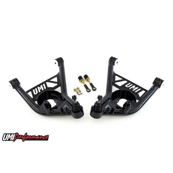 UMI’s 2nd Generation F-Body lower a-arms are perfect for the F-Body enthusiast seeking to improve the performance and appearance of their front suspension. The UMI 2652’s feature caster relocation of the ball joint to enhance steering feel and improve high speed stability. The heavy duty spring bucket accepts factory and aftermarket coil springs as well as the popular hybrid coilover units. Laser cut UMI reinforcement plates add a great appearance and excellent strength. UMI’s robust a-arms include greaseable, UMI designed and manufactured Delrin bushings that offer supremely smooth suspension action and precision operation. Double shear swivel sway bar end links are included and work nicely with UMI sway bar P/N 4035 and also most aftermarket stock eyelet type sway bars. Available in UMI red or gloss black powder coat. 100% designed, manufactured and raced with pride in the USA.