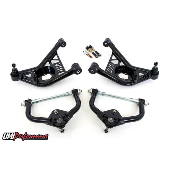 UMI’s 2nd Generation F-Body a-arms are perfect for the F-Body enthusiast seeking to improve the performance and appearance of their front suspension. This kit features caster relocation of both the upper and lower ball joints to enhance steering feel and improve high speed stability. As designed, the caster range is 5-7 degrees. The spindle pin location remains unchanged so fender clearance is like stock. The upper a-arms include CrMo offset cross shafts to reduce the amount of shims required when setting camber. A pancake style polyurethane bump stop and high quality ball joint is included. The heavy duty lower spring bucket accepts factory and aftermarket coil springs as well as the popular hybrid coilover units. Laser cut UMI reinforcement plates add a great appearance and excellent strength. UMI’s double shear sway bar end links are included and work nicely with UMI P/N 4035 sway bar and also most aftermarket stock eyelet type sway bars. Available in UMI red or gloss black powder coat. 100% designed, manufactured and raced with pride in Philipsburg, PA - USA.