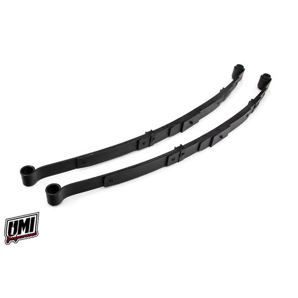 UMIs rear leaf spring is a high performance solution to lowering the rear of your 1970-1981 Camaro or Firebird. These springs feature high quality US Steel, multi-leaf construction and lower the car an average of 2" to 2-½" below stock ride height. They bolt directly into the stock location with no modifications required. The front eyelet features a pre-installed rubber bushing to maintain ride comfort. The rear eyelet is bare and requires factory bushings or optional UMI 2625 (poly) or 2626 (Delrin) bushing and shackle kit (please see our other items).